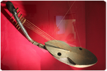 Regardons cette harpe à cinq cordes des Mangbétu. La caisse de résonnance est prolongée par un long cou orné d’une tête féminine en bois d’ébène, à la chevelure finement travaillée, qui s’incorpore harmonieusement aux lignes de l’ensemble. La forme allongée de la tête provient de ce que les Mangbétu avaient la coutume d’enserrer la tête de leur bébé dans des bandelettes (écorce) pour lui donner un bel aspect.